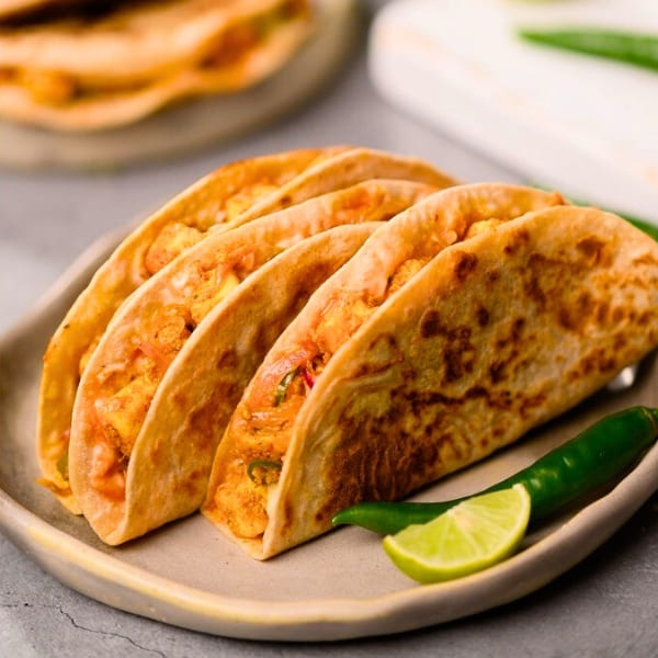 (Naan bread tacos filled with Tandoori Paneer, veggies & served with special sauce)